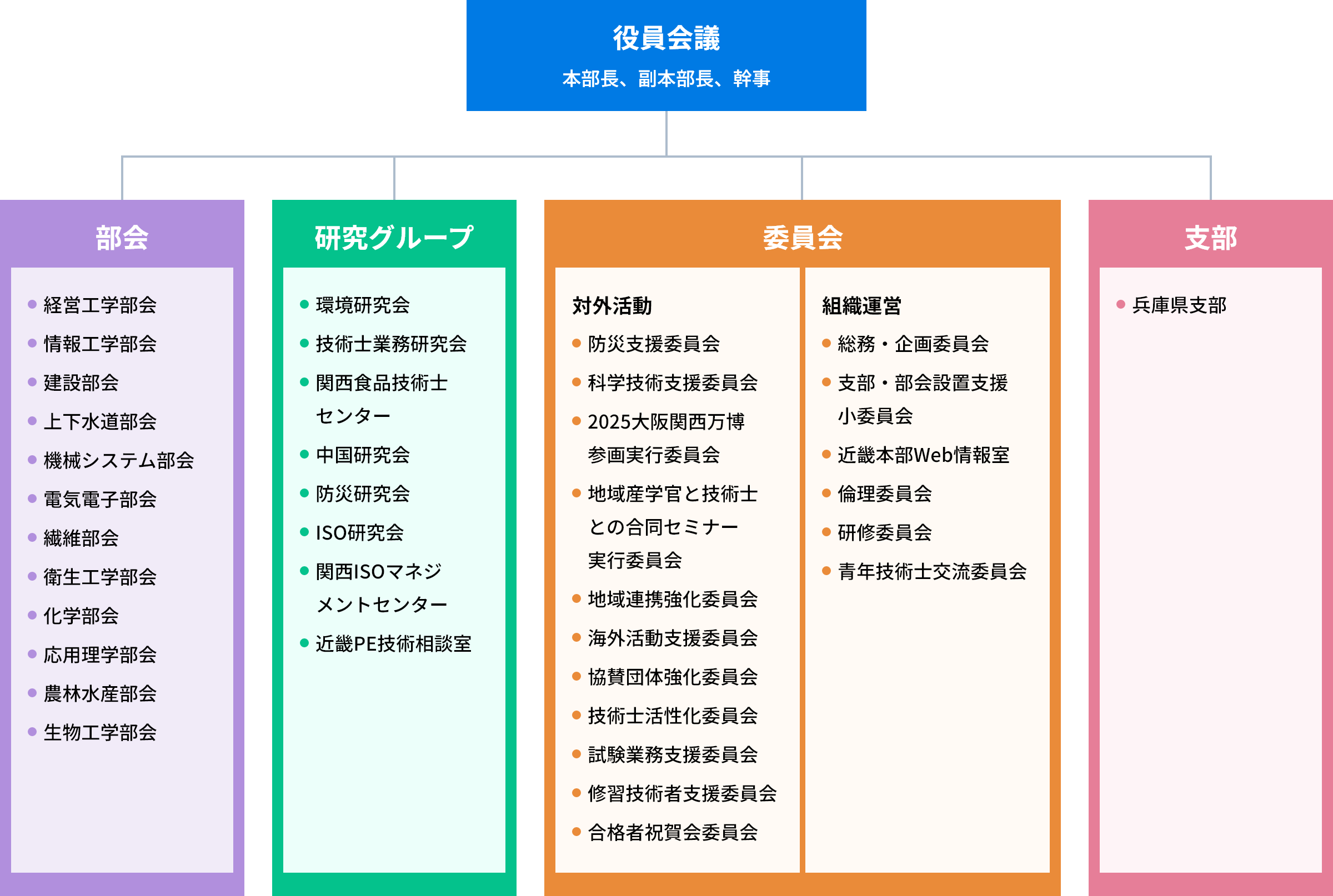 日本技術士会の下部組織で、近畿2府4県を統括しています。近畿の技術士に対し、本部、行政機関・関係諸学会等の情報を収集して会員に連絡すること、会員の資質向上のためCPD(研修会、現場見学会等)を行っています。